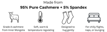 Made with 95% luxurious cashmere for unmatched softness and warmth, these socks include 5% spandex to add gentle stretch, durability, and shape retention. This thoughtful blend ensures a comfortable, stay-put fit that recovers after wear while preserving the sumptuous feel of pure cashmere.