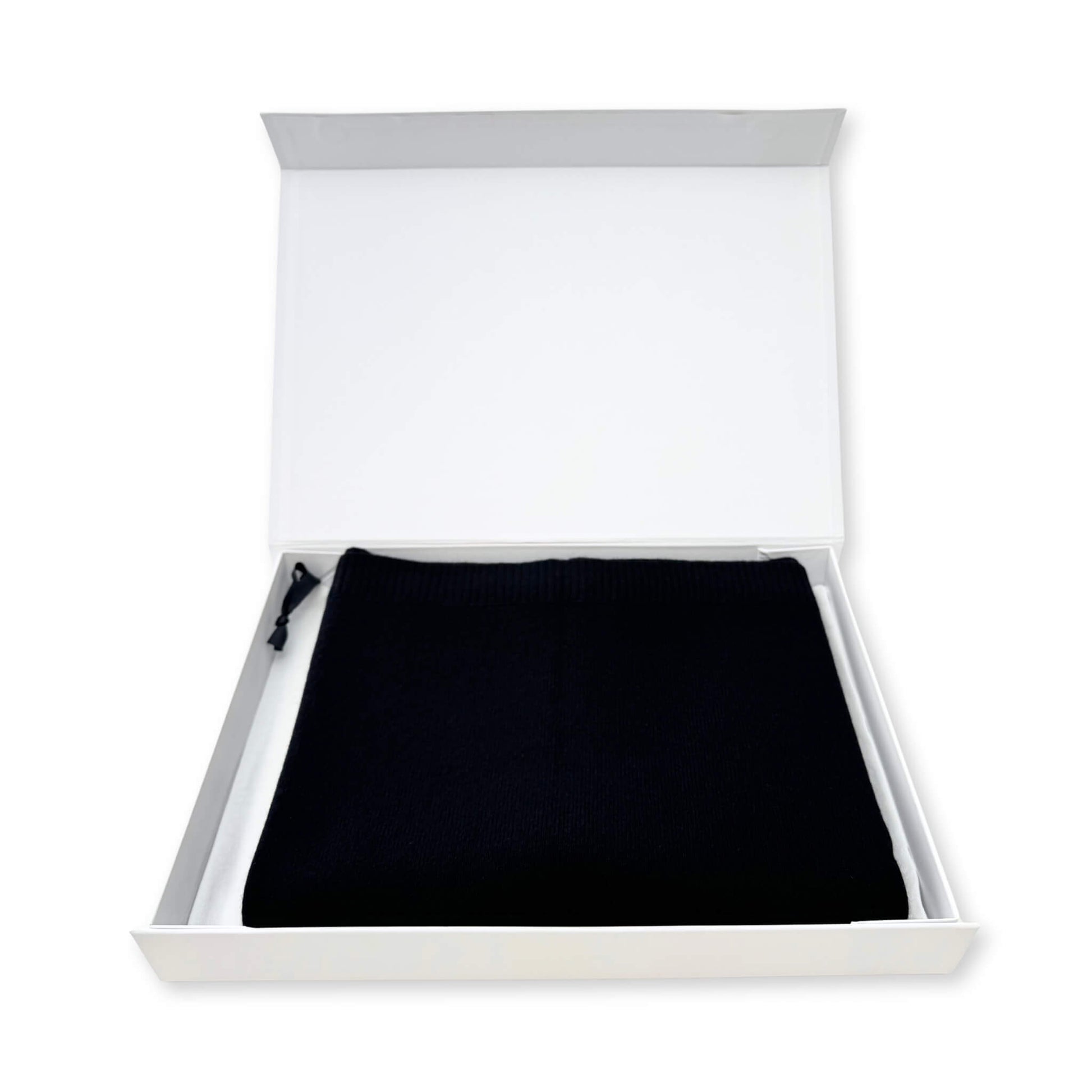 Wrap yourself in comfort on your next flight with this 100% cashmere travel blanket, finished with a refined ribbed border. Measuring 60" x 35", it comes with a protective cotton storage pouch to keep it clean and ready for your next journey. Offered as a sample at a special price.
