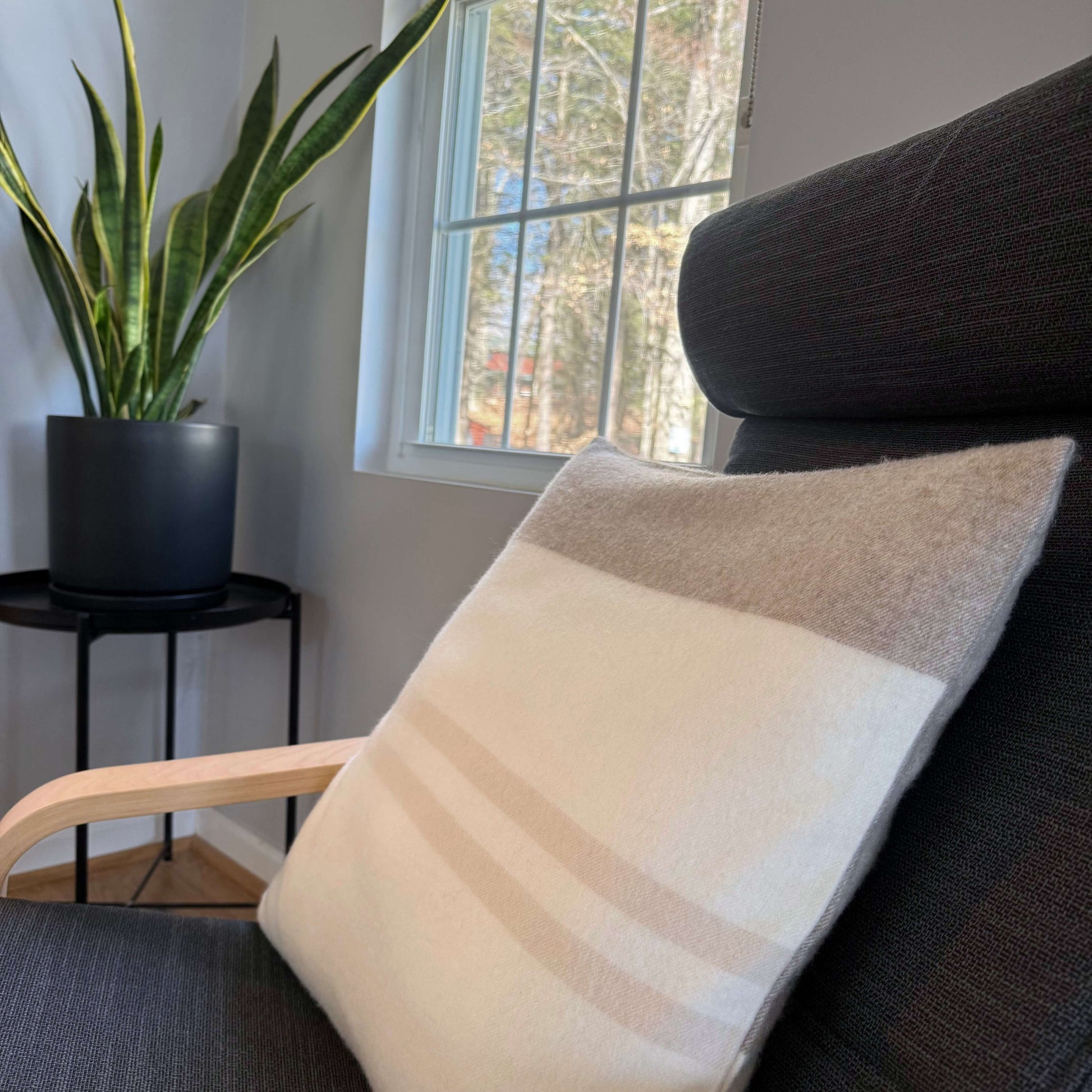 Whether you're cozying up on your sofa or bed, our 'Home and Away' Cashmere Throw Pillow invites you to relax and unwind. Crafted from 100% natural undyed cashmere for extra softness, it adds comfort to your sofa or armchair and as an accent and blissfully soft pillow on your bed. The woven cashmere design is a durable choice, less susceptible to holes compared to knitted cashmere, ensuring lasting luxury.